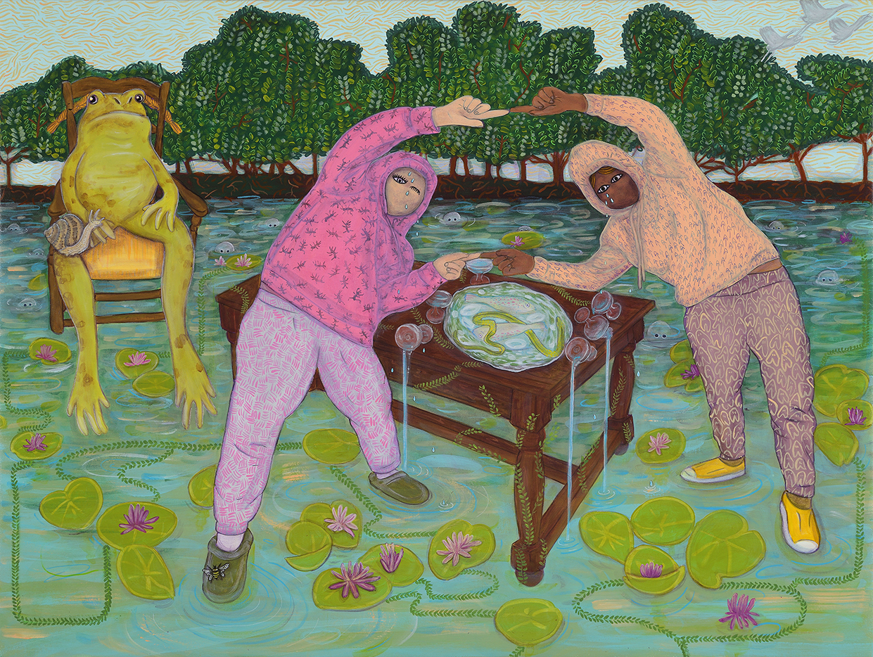 Fanny Mesnard construit une trame narrative à partir de motifs récurrents (escargots, nénuphars, tables, mains, hoodie, etc.) et inspirés de contes revisités d’où surgissent des créatures liminaires qui explorent les lieux en prenant des postures incongrues. Sont-elles en train de danser ? Sont-elles occupées à un rituel ? Créant ses personnages en prenant soin d’ouvrir leurs sens, l’artiste nous invite à voir le monde sous d’autres angles, à imaginer comment ils pourraient vivre sur de nouveaux territoires. À vous maintenant de prendre part au parcours proposé dans ce lieu d’exposition métamorphosé en devenant, à votre tour, une partie de ce récit vivant.