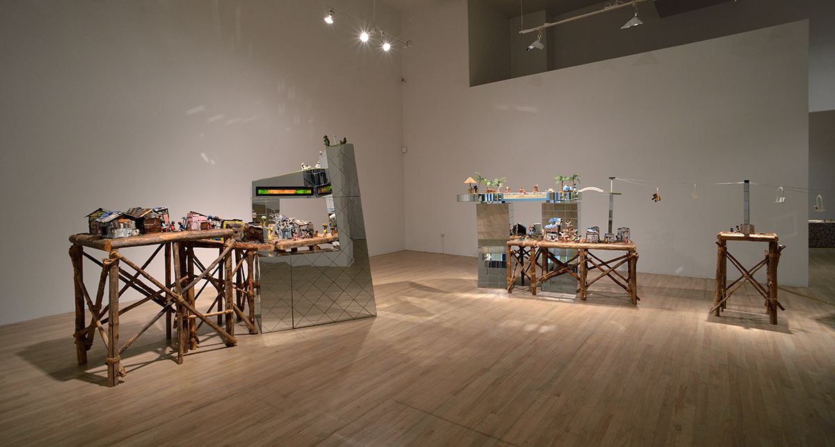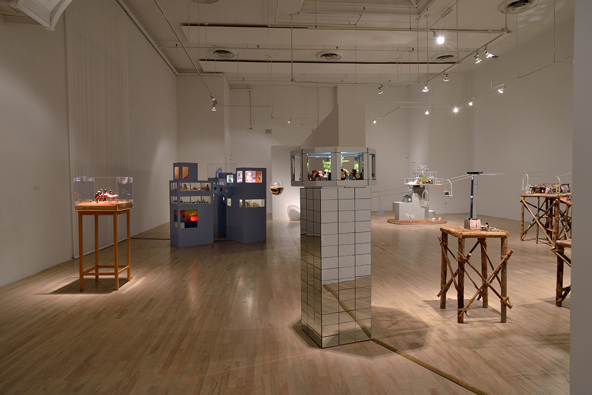 Over the past ten years, Karine Giboulo's artworks have been challenging the way our society works, taking a critical stance on various issues related to life in the first world: industrialization, capitalism, consumerism, hyper-consumerism, urbanization, globalization, worker exploitation, the growth of slums and megacities, and the ongoing isolation of the individual.The importance and scope of Giboulo's work justifies a retrospective exhibition at this point in her relatively young art career. Réalité / Utopie allows for an overview of her work's evolution in several mediums – drawing, dioramas, "life bubbles" – as well as her exploration of various socially and humanistically-oriented preoccupations. Both realistic and fanciful, these artworks abound with details. Giboulo stages figurines of people and animals made of polymer clay painted in bright colours within installations that evoke the world of childhood and draw the spectator in with their whimsical nature. However, the intention behind the work contrasts strongly with this playfulness, compelling the spectator to question and critique.